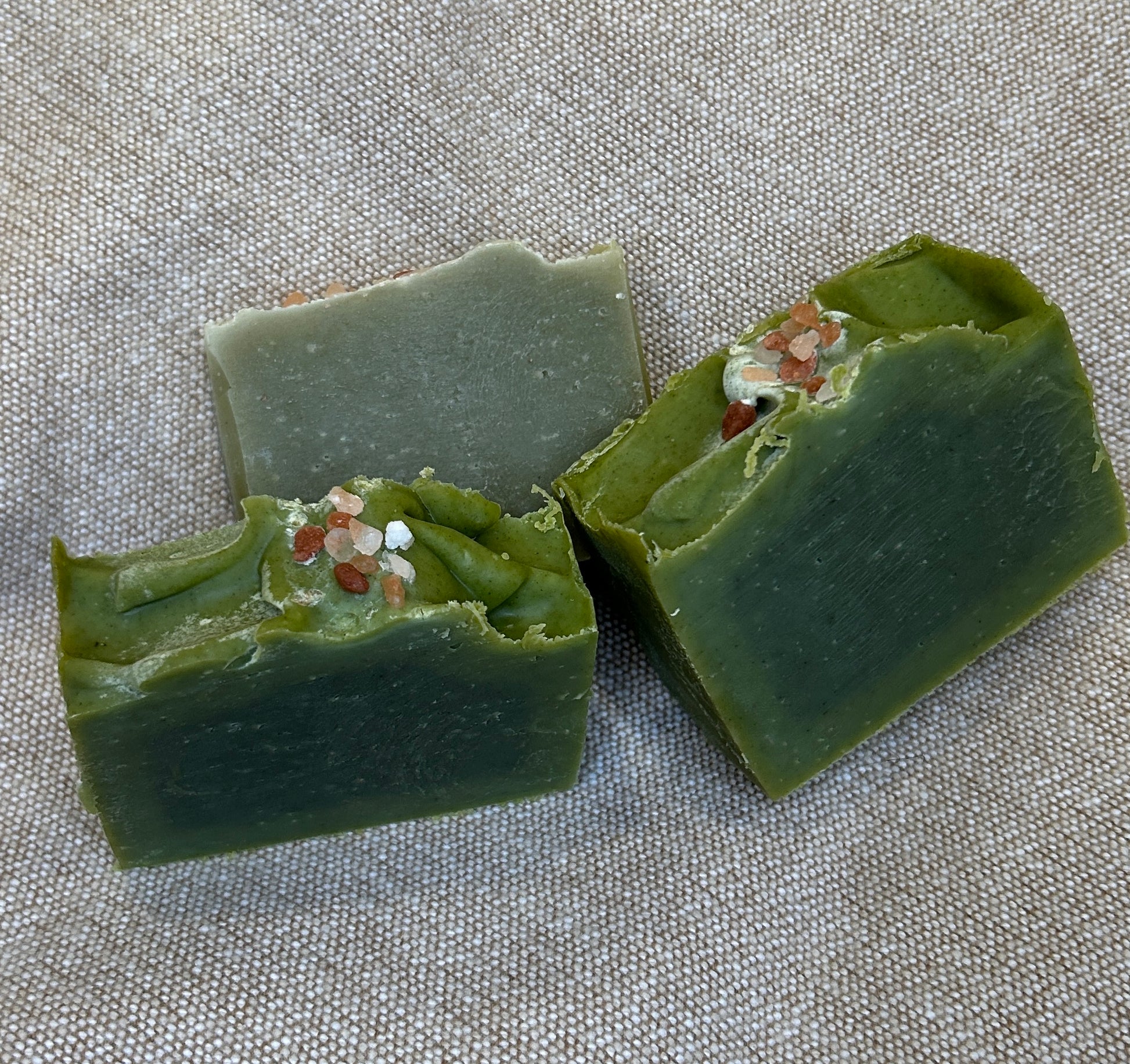 A rich, woodsy blend of balsam fir anchors this bar with crisp, resinous notes reminiscent of frosted pine needles. Natural spirulina gives the soap its soft evergreen hue, while a sprinkle of Himalayan pink sea salt adds both gentle exfoliation and a touch of rustic texture on top.